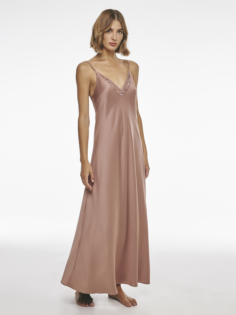 Νυχτικό maxi σατέν caramel Lida Lingerie. Με v neck μπροστά και πίσω διακοσμημένο με δαντέλα και λεπτές ρυθμιζόμενες τιράντες