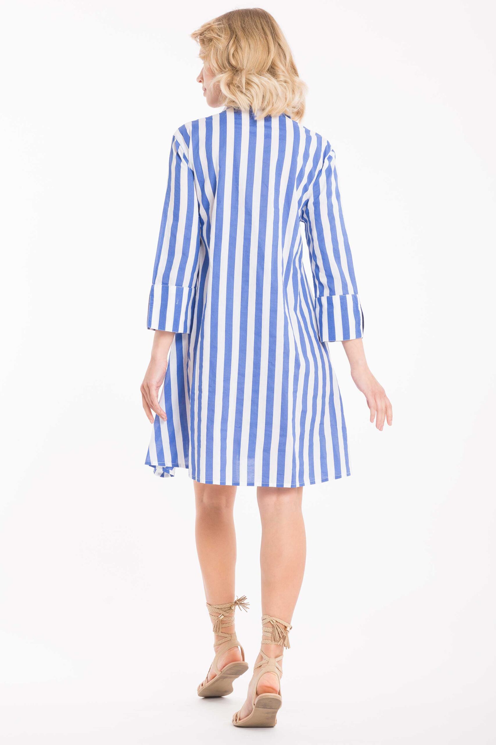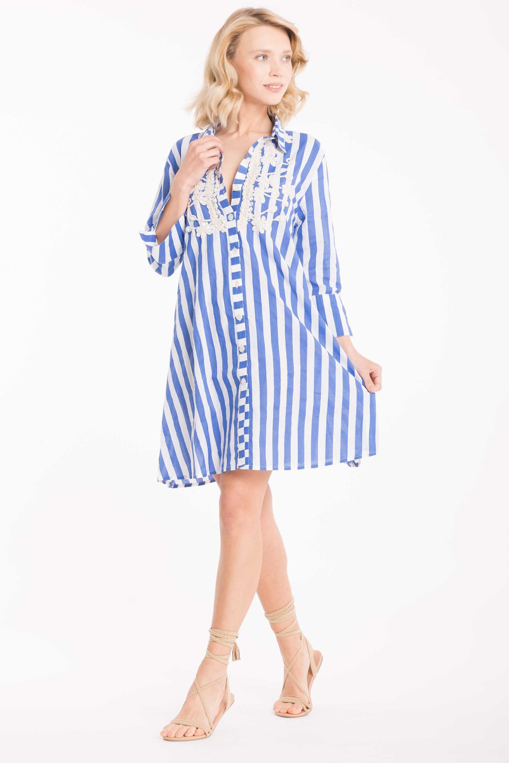 Φόρεμα πουκαμίσα ριγέ μπλε ηλεκτρίκ Iconique. Με πέτο γιακά και κουμπιά. Μανίκι 3/4 και κεντήματα λευκά στο στήθος. Σε αμπίρ γραμμή. Φοριέται και σαν ρούχο και πάνω από το μαγιό σας