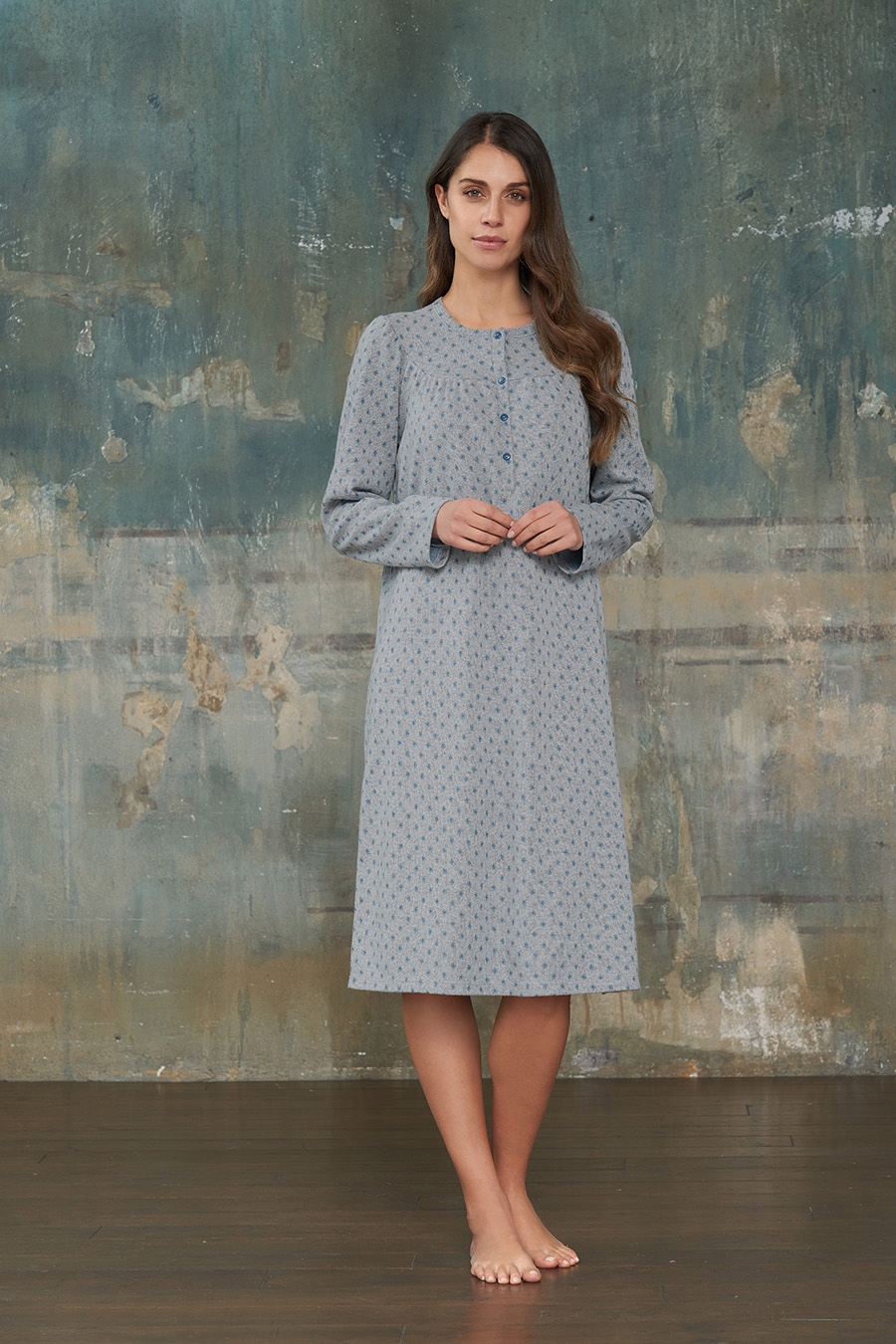 Νυχτικό homewear fleece γκρι φόντο με μπλε οινοπνευματί λεπτομέρειες με στρογγυλή λαιμόκοψη και κουμπιά. Ωμίτη μπρος και πίσω για έξτρα άνεση