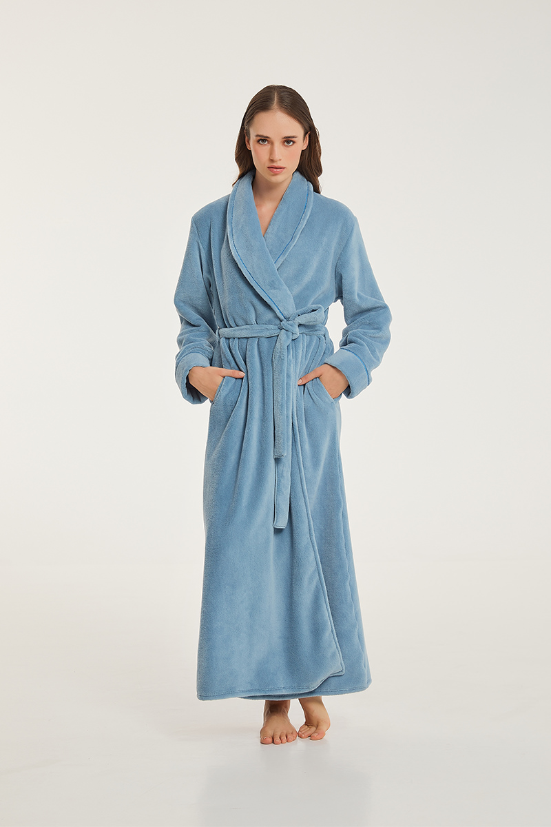 Ρόμπα maxi dusty blue fleece Penky. Με γιακά, χιαστί με ζώνη και τσέπες.