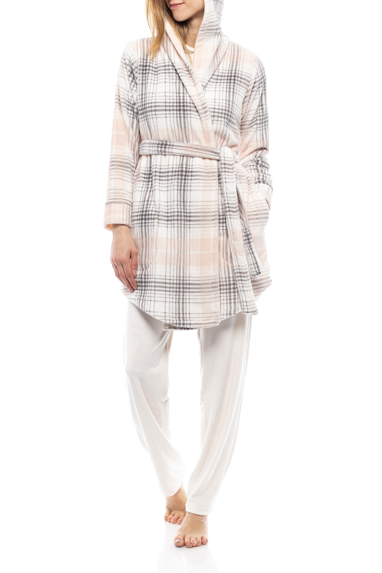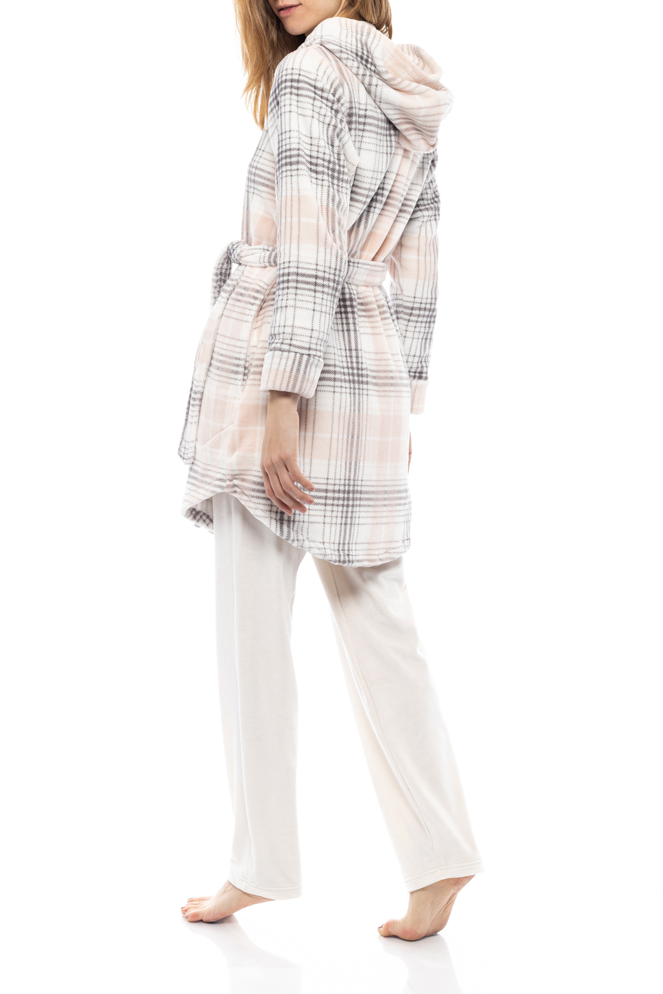 ρόμπα σωμών και γκρι καρό fleece Pink Label. Χιαστί με ζώνη και κουκούλα και τσέπες.