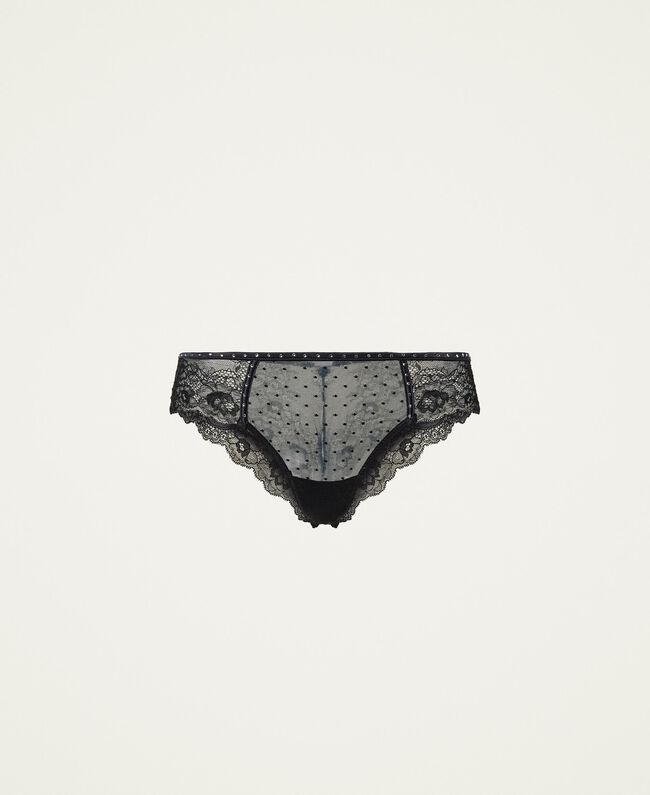 Slip brazil μαύρο Twin Set. Βραζιλιάνικο σλιπ από τούλι plumetis μπροστά, δαντέλα στα πλαϊνά και πίσω, στρας στη μέση. Χωρίς ραφές στο πίσω μέρος. Ταιριάξτε το με το σουτιέν push-up της ίδιας σειράς για να δημιουργήσετε το πιο περιζήτητο σετ εσωρούχων της σεζόν.