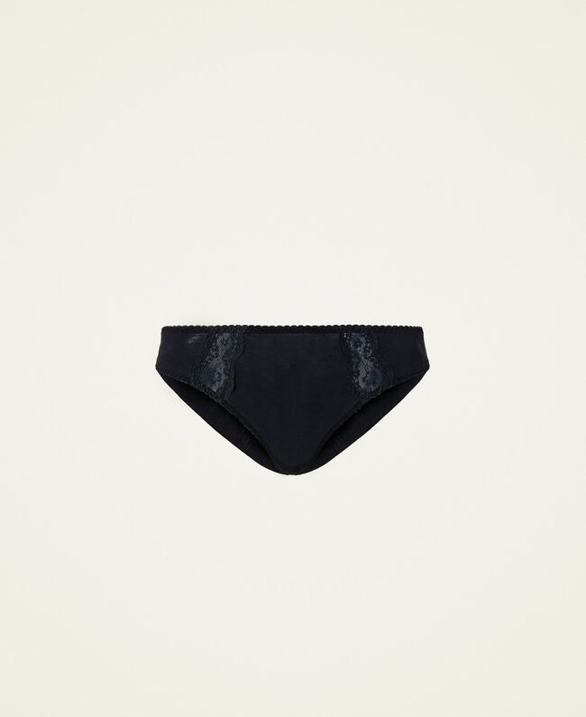 Slip brazil μαύρο Twin Set. Micromodal βραζιλιάνικο σλιπ με δαντέλα με χρυσοκλωστή, διπλό ύφασμα στο πίσω μέρος. Τέλεια εφαρμογή για αυτό το σλιπ που παραμένει αόρατο ακόμη και κάτω από το πιο σφιχτό φόρεμα, χάρη στο ομαλό πίσω μέρος από διπλό ύφασμα. Δαντέλα δεξιά και αριστερά στο μπροστινό μέρος. Συνδυάστε το με push-up σουτιέν ή με επενδυμένο τρίγωνο για άψογη εμφάνιση.