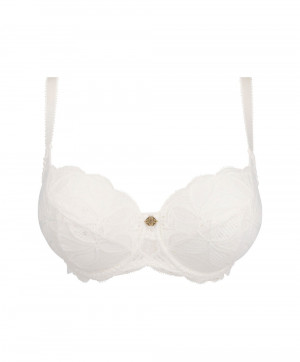 Σουτιέν Stricto Sensuelle Antigel de Lise Charmel με μπανέλα σε εκρού χρώμα. Half cup για καλλίγραμμο ντεκολτέ. Κατασκευασμένο από απαλό και μεταξένιο πλεκτό μικροϊνών για εξαιρετική εφαρμογή και άνεση σε συνδυασμό με λουλουδάτο πλέγμα για πρωτοτυπία και αίγλη. Αυτό το σουτιέν εξασφαλίζει στήριξη και σπάνια κομψότητα με όμορφα τελειώματα από λουλουδάτη δαντέλα. Με ραφές verticlas, εσωτερική επένδυση από τούλι και ρυθμιζόμενες ελαστικές τιράντες.