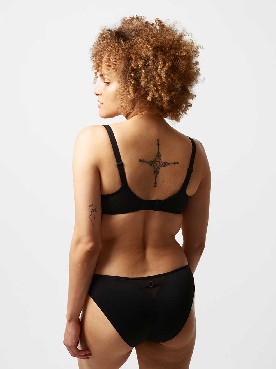 Σουτιέν Chantelle με επένδυση και μπανέλα σε μαύρο χρώμα. Δαντέλα στο πλάι, ανάμεσα και πάνω στις cups. Διακοσμητικά χρυσά κρικάκια στις τιράντες.